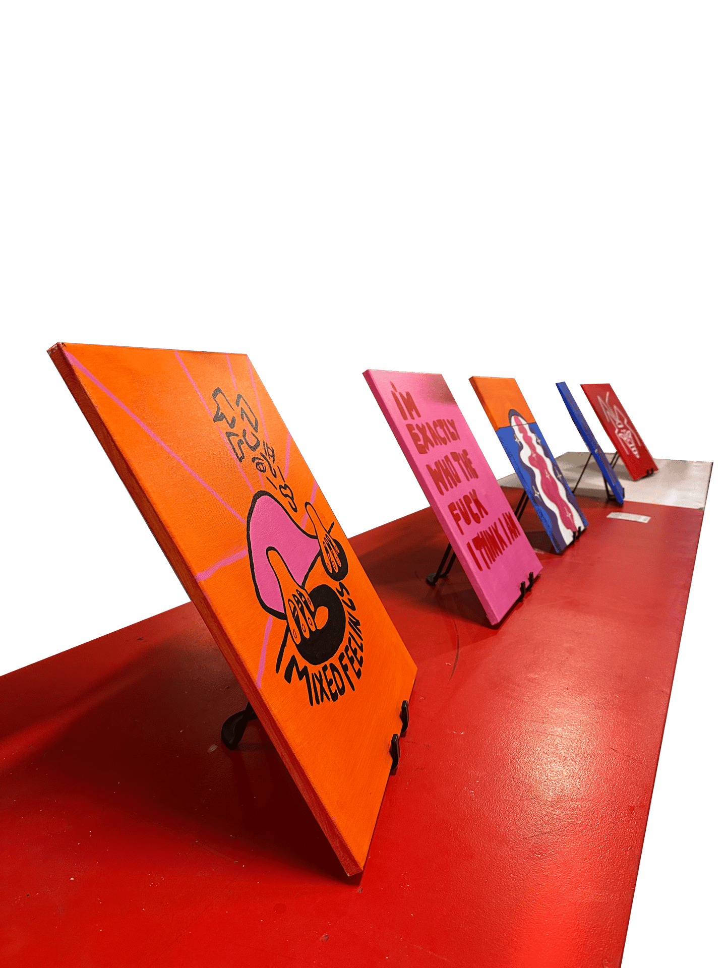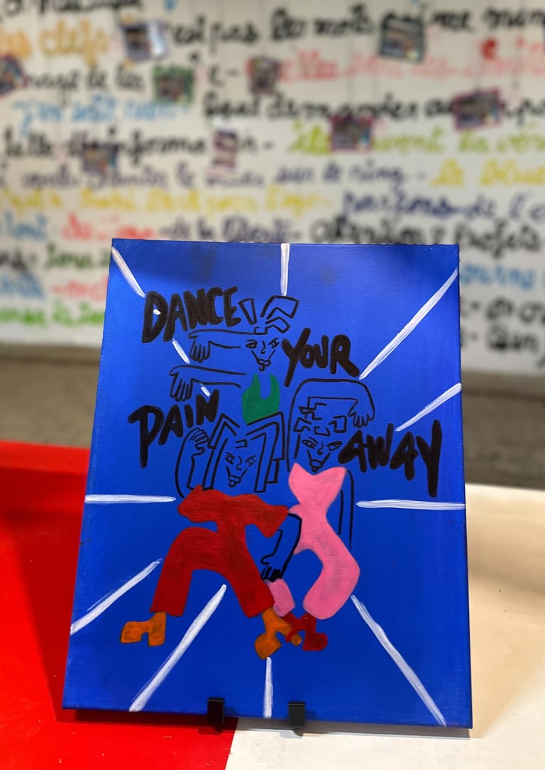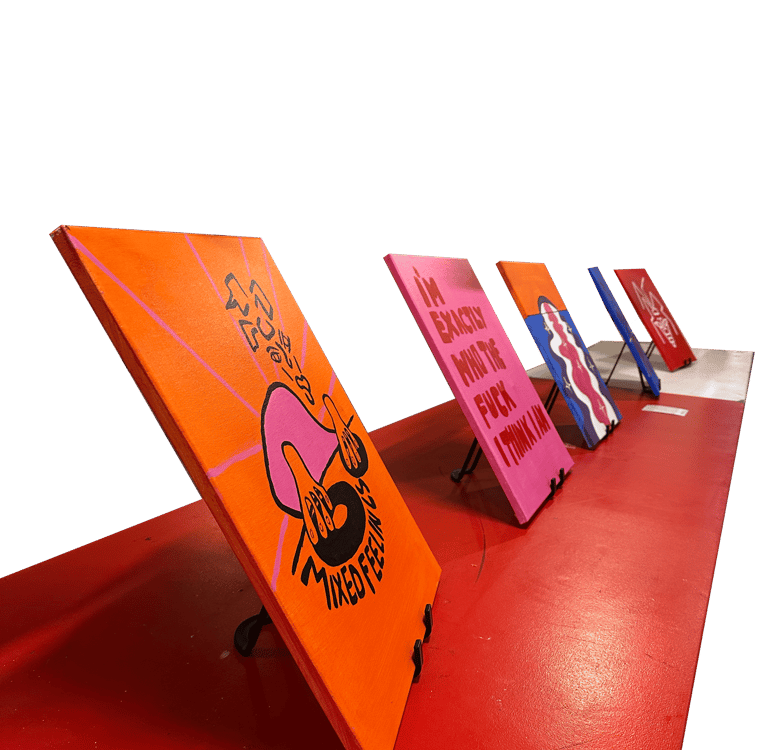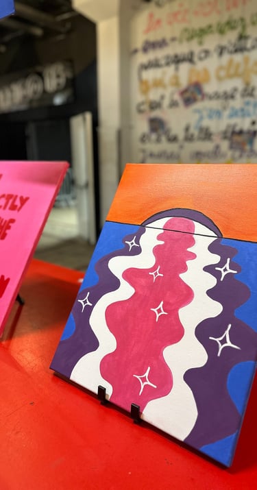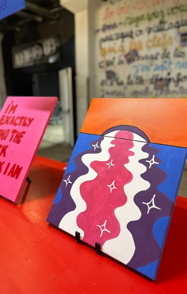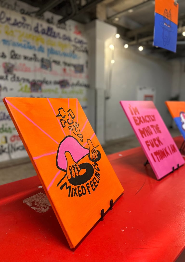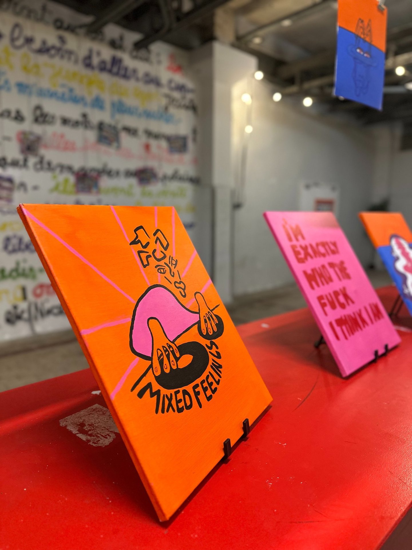 À travers des couleurs vibrantes, des formes affirmées et une touche d’humour, l’artiste partage son propre cheminement. Chaque œuvre devient un espace de dialogue entre fragilité et puissance, entre chaos et lumière.
